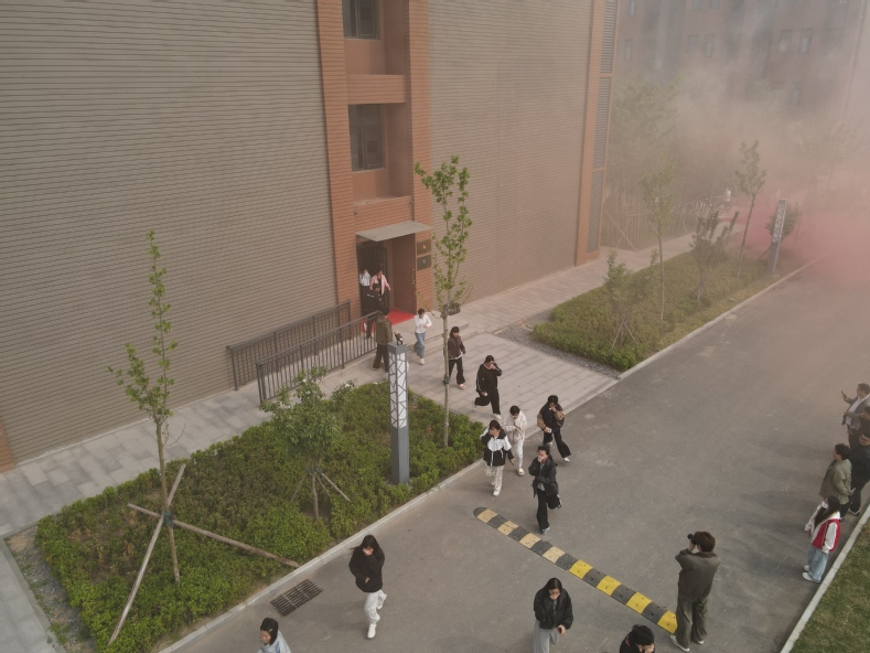随着演练警报正式拉响,同学们迅速响应,在辅导员和保卫处老师的全程引导下,严格按照前期培训的逃生规范,弯腰捂鼻、低姿快速行进,沿指定安全通道有序撤离。全程紧张有序、衔接顺畅,高效完成疏散任务,充分展现了师生良好的应急素养与纪律意识。